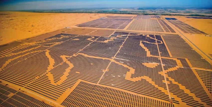 內(nèi)蒙古達(dá)拉特電站利用與周圍植被和黃沙之間的色差,將196320塊藍(lán)色光伏組件板拼接成為一幅駿馬圖騰,宛如一匹在茫茫黃沙中肆意馳騁的駿馬,產(chǎn)生的清潔能源宛如駿馬脈絡(luò)一般游走,向外輸出源源不斷的電能。