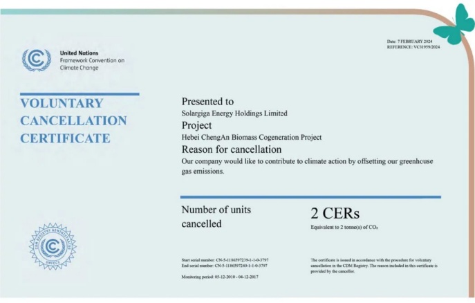 于報告期內(nèi),陽光能源成功實施了多項減碳措施,包括利用碳抵消來實現(xiàn)溫室氣體排放強度的降低。我們利用的碳抵消專案是聯(lián)合國清潔發(fā)展機制(CDM)的河北成安生物質(zhì)熱電聯(lián)產(chǎn)專案(專案編號:3797)。該專案產(chǎn)生的電力出售給河北省電網(wǎng),以替代燃煤發(fā)電廠的產(chǎn)能。此項目不僅減少了溫室氣體排放,還促進了資源效率、環(huán)境保護和對當(dāng)?shù)厣鐓^(qū)的社會經(jīng)濟效益。通過此項目獲得的核證減排量(CERs)對于實現(xiàn)2022年在杭州舉行的第19屆亞洲運動會和第4屆亞洲殘疾人運動會的碳中和起到了關(guān)鍵作用。