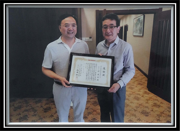 2013年9月,向井和司先生(右:夏普能源事業(yè)部本部長(zhǎng))為感謝陽(yáng)光能源對(duì)夏普的支持和幫助,授予譚文華先生(左:錦州陽(yáng)光能源董事長(zhǎng))感謝信。