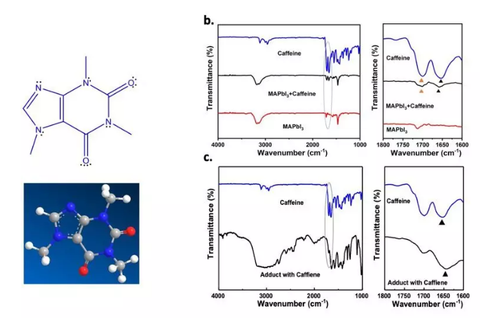 楊陽(yáng)研究小組用加熱的方法將咖啡因添加到40個(gè)太陽(yáng)能電池的鈣鈦礦層中,並使用紅外吸收光譜來(lái)確定咖啡因是否成功地與鈣鈦礦結(jié)合了。他們發(fā)現(xiàn)了咖啡因在與鈣鈦礦結(jié)合後,咖啡因中的羰基的特徵峰發(fā)生了移動(dòng),這意味著咖啡因已經(jīng)成功與鈣鈦礦結(jié)合了。