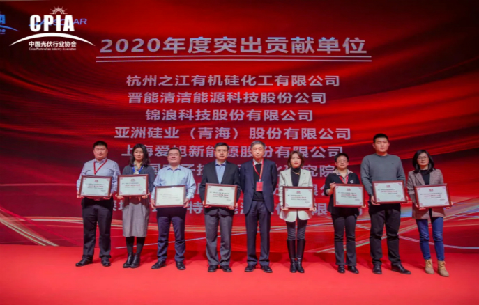 為感謝2020年度在協(xié)會(huì)各項(xiàng)會(huì)議活動(dòng)、標(biāo)準(zhǔn)及戶用工作等方面,做出突出貢獻(xiàn)的會(huì)員單位,在2020年中國(guó)光伏行業(yè)年度大會(huì)期間,特授予天合光能股份有限公司、晶澳太陽(yáng)能科技股份有限公司、晶科能源有限公司、陽(yáng)光電源股份有限公司、浙江正泰新能源開(kāi)發(fā)有限公司、隆基綠能科技股份有限公司、華為技術(shù)有限公司、錦州陽(yáng)光能源有限公司、通威股份有限公司、杭州之江有機(jī)矽化工有限公司、晉能清潔能源科技股份公司、錦浪科技股份有限公司、亞洲矽業(yè)(青海)股份有限公司、上海愛(ài)旭新能源股份有限公司、蘇州賽伍應(yīng)用技術(shù)股份有限公司、深圳古瑞瓦特新能源股份有限公司、中國(guó)電子技術(shù)標(biāo)準(zhǔn)化研究院17家單位“2020年度突出貢獻(xiàn)獎(jiǎng)”。