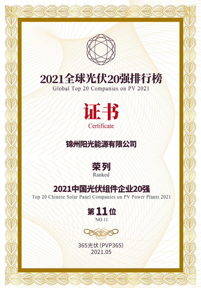 排行榜以上一年度全球光伏行業(yè)各企業(yè)全年光伏相關(guān)專案、產(chǎn)品及服務(wù)等營業(yè)收入、全球出貨量、全球並網(wǎng)裝機量等財務(wù)資料為排名依據(jù)?!坝觅Y料看發(fā)展,以業(yè)績證實力”此次排行榜依託於企業(yè)在光伏領(lǐng)域的不斷探索與耕耘,錦州陽光能源有限公司成功入圍“2021中國光伏元件企業(yè)20強”,位元列第十一位!